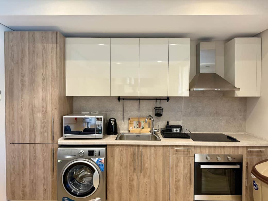 Open, fully equipped with all essential cooking tools and utensils, including a Nespresso machine, kettle, microwave, stove, oven, fridge, freezer, and washing machine.