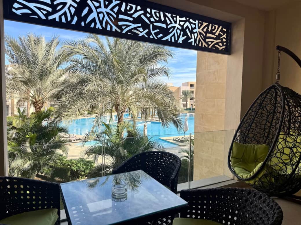 Overlooking the main pool, the balcony is furnished with a dining table set and a cozy swing, perfect for relaxing and enjoying meals outdoors.