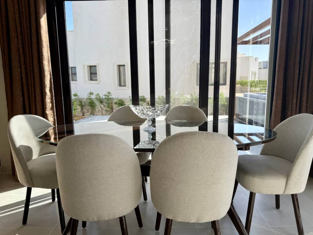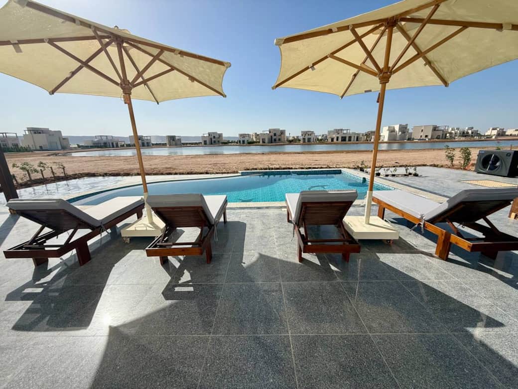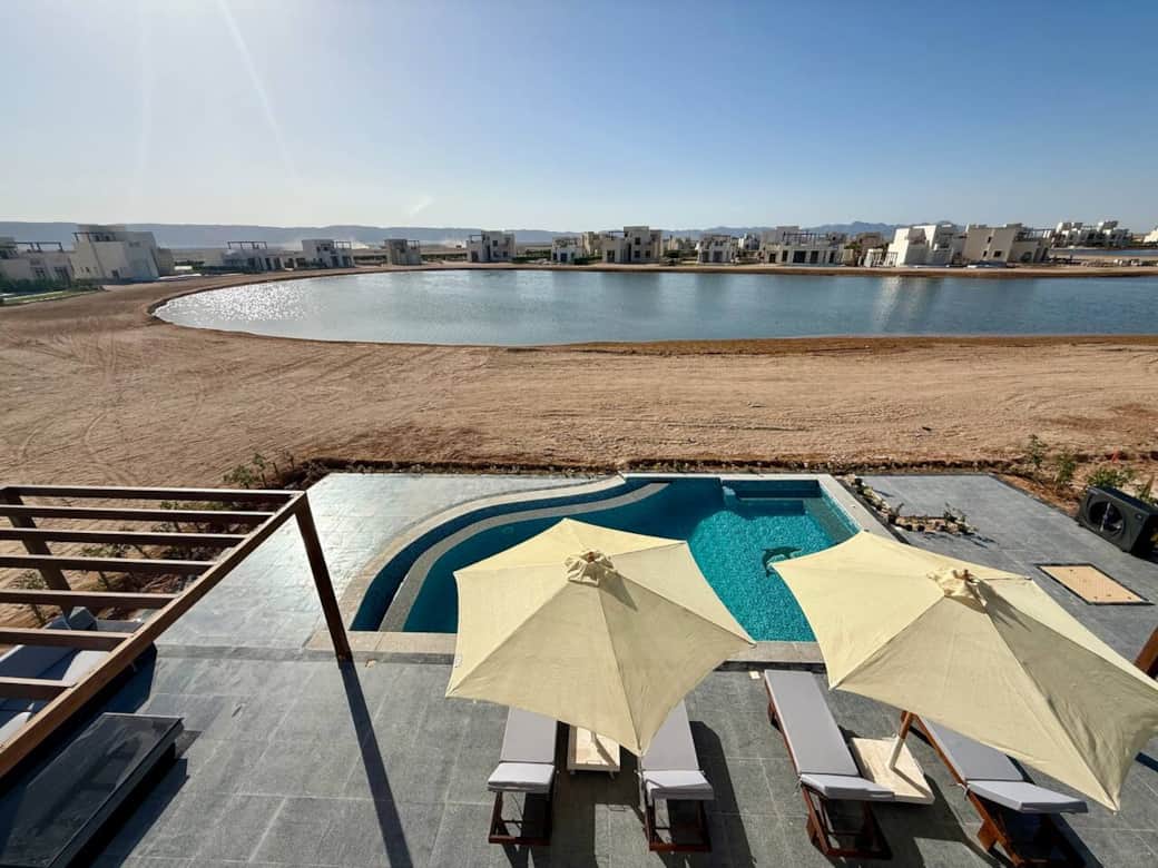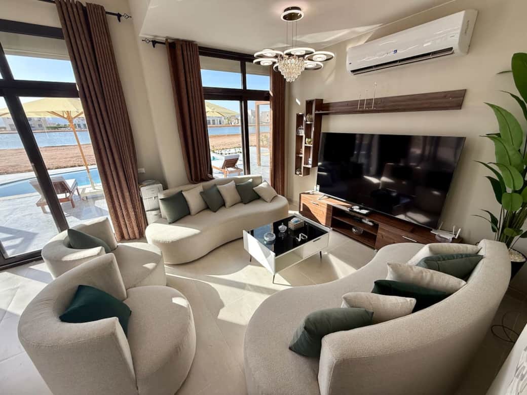 This bright standalone villa in Cyan, El Gouna’s beloved compound, offers breathtaking views of a swimmable lagoon, just steps from a huge terrace with a private heated pool with a built-in jacuzzi.